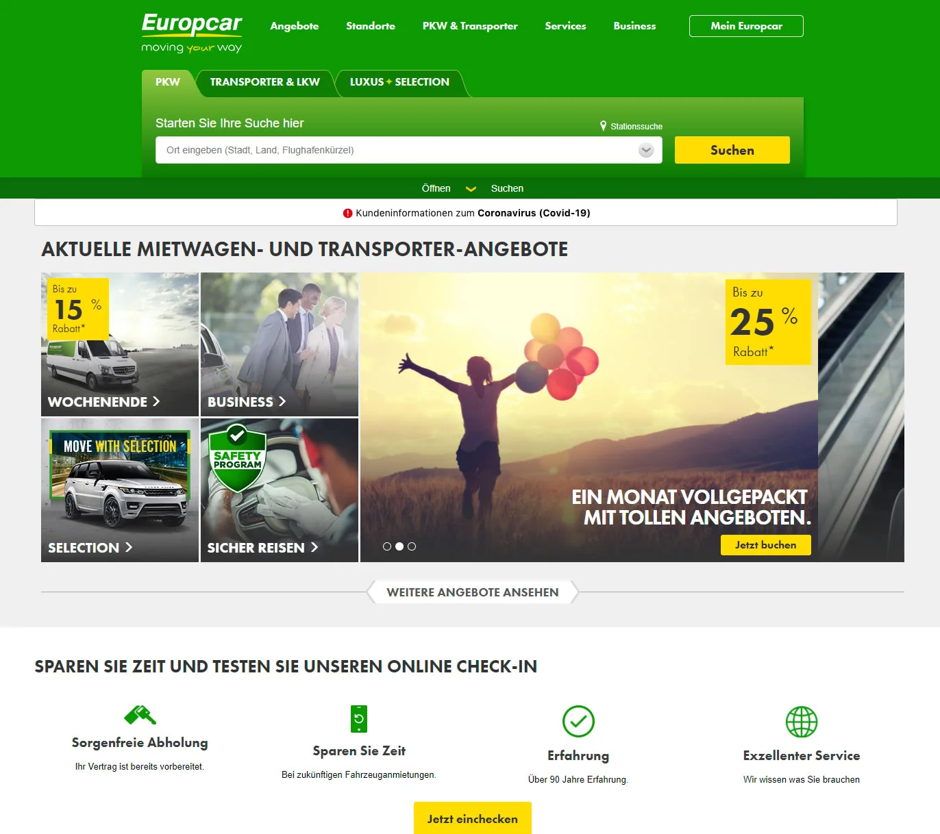 Ob an einer Europcar-Station oder bequem per Lieferung zu Ihnen nach Hause: Steigen Sie ein und genießen Sie sorgenfreie Mobilität. Um Versicherung, Wartung und alle Formalitäten kümmert sich Europcar.
