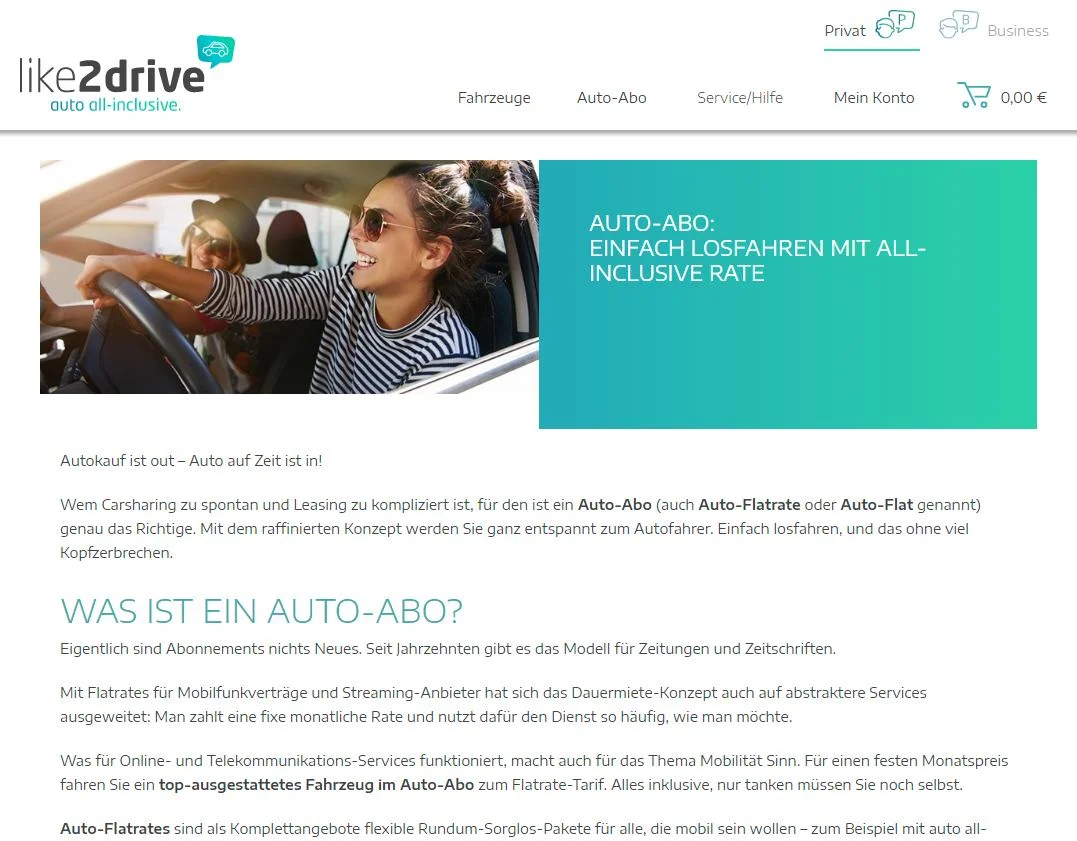 Sie finden den Anbieter unter folgender URL / Quelle: https://like2drive.de/angebotes/auto-flatrate. Gerne können Sie als User oder Anbieter mit uns Kontakt aufnehmen.