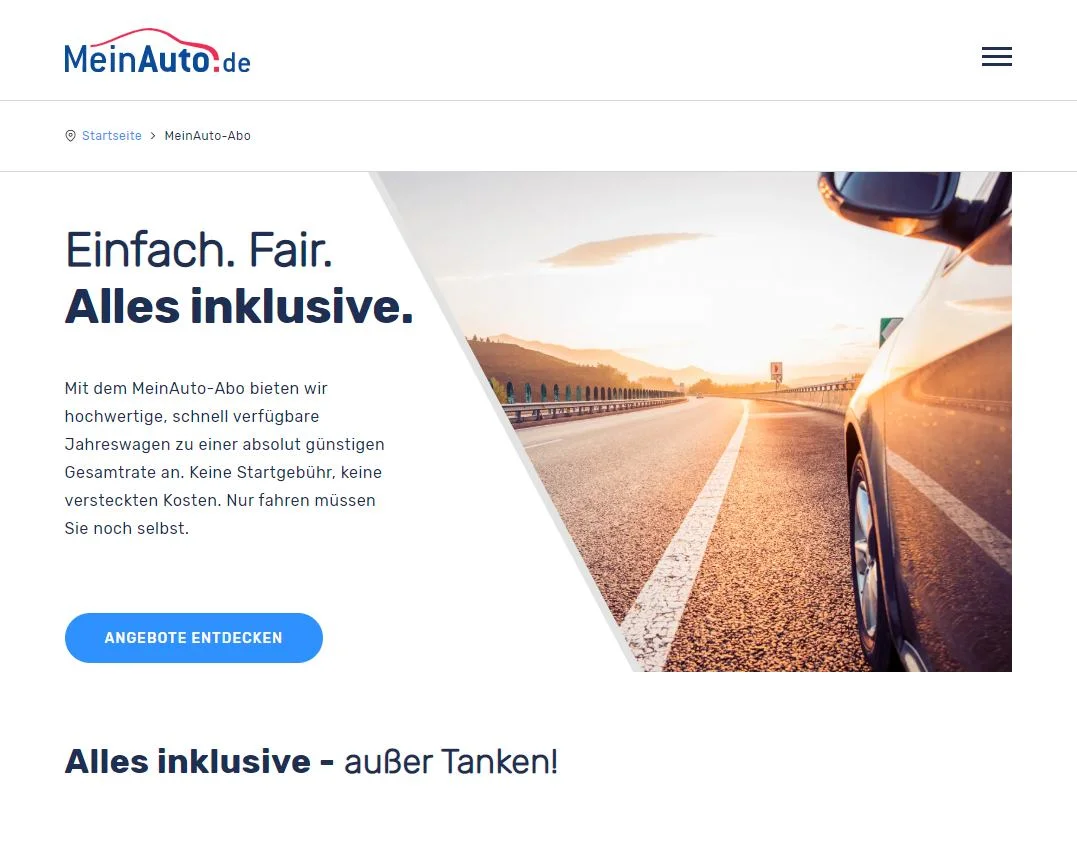Mit dem MeinAuto-Abo bietet der Anbieter hochwertige, schnell verfügbare Jahreswagen zu einer absolut günstigen Gesamtrate an. Keine Startgebühr, keine versteckten Kosten. Nur fahren muss man noch selbst. Die Fahrzeuge sind neuwertige, gepflegte Jahreswagen aus erster Hand. Diese werden vor Auslieferung streng geprüft und sorgfältig aufbereitet. Zur Auswahl stehen ausschließlich umfangreich ausgestattete Modelle von zahlreichen Marken.